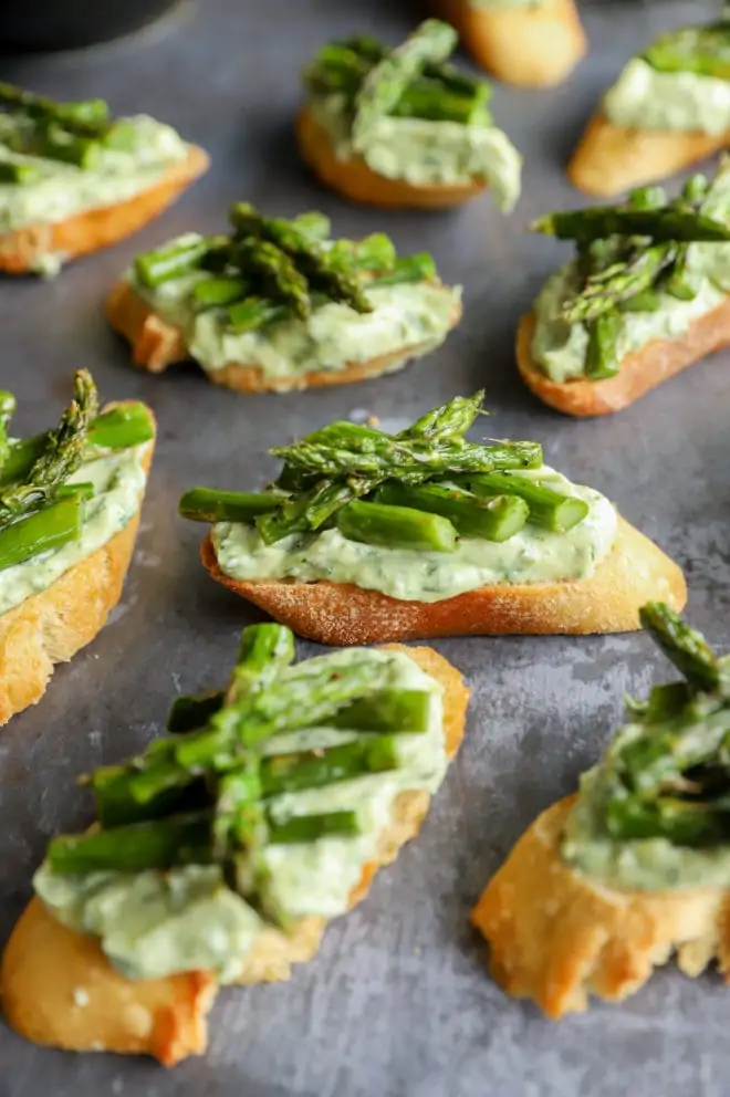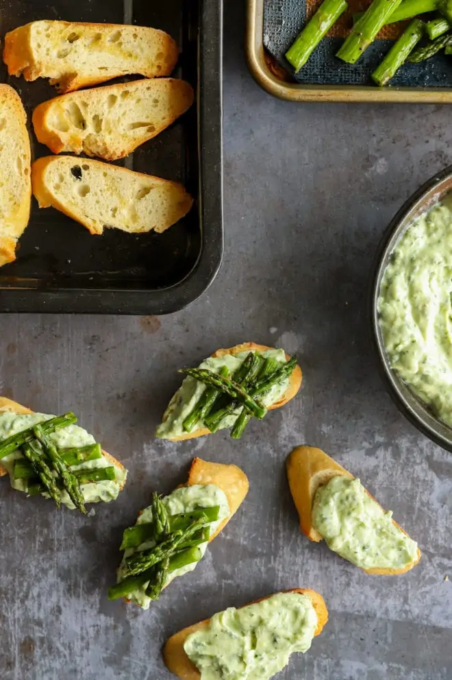 You can definitely make the elements of this appetizer ahead of time. I recommend making the whipped ricotta and roasting the asparagus beforehand. You can store them separately in containers in the refrigerator. Simply assemble on toasted slices of baguette when ready to serve!