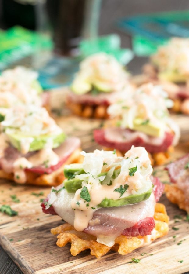 Avocado Reuben Bites make any get together more memorable, whether you are celebrating something special or it’s just a random Saturday! Layers of corned beef, Swiss cheese and sauerkraut are enhanced by creamy avocado, then piled high on waffle fries and topped off with traditional Thousand Island dressing. It’s the simplest way to make the classic Reuben bite sized (and even more delish!).