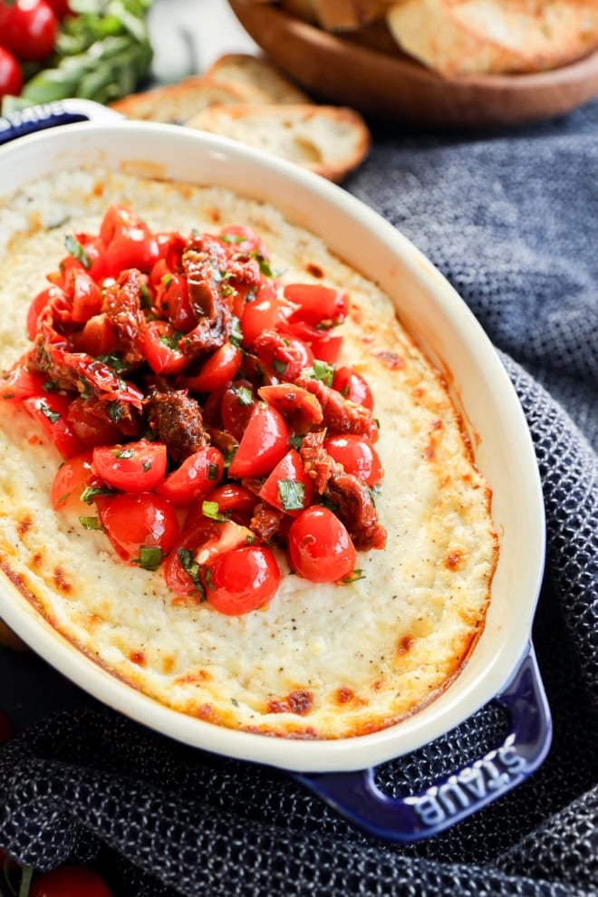 The magic happens in the oven as the goat cheese softens to the perfect scoopable consistency. But the real showstopper? A vibrant topping of sun-dried tomatoes mixed with sweet cherry tomatoes, fresh basil, and a kick of red pepper flakes that adds color, texture, and bold flavor to every scoop.