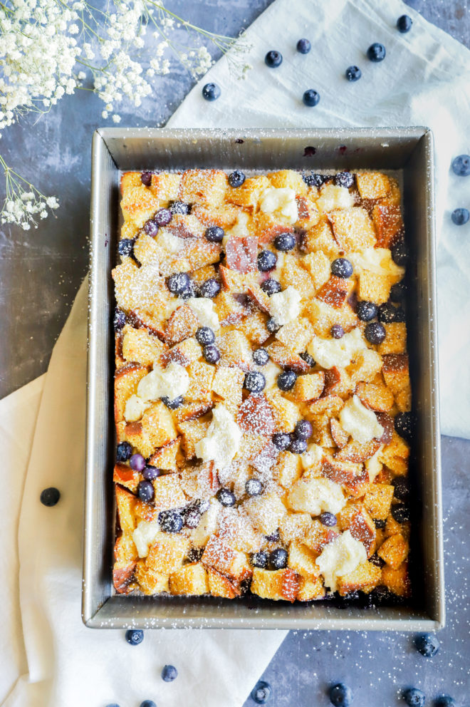 Spray a 9×13-inch baking pan with nonstick cooking spray. Add half of the bread, top with dollops of half the cream cheese mixture, and top with half the blueberries. Finish layering the remaining bread, dollops of cream cheese, and blueberries.