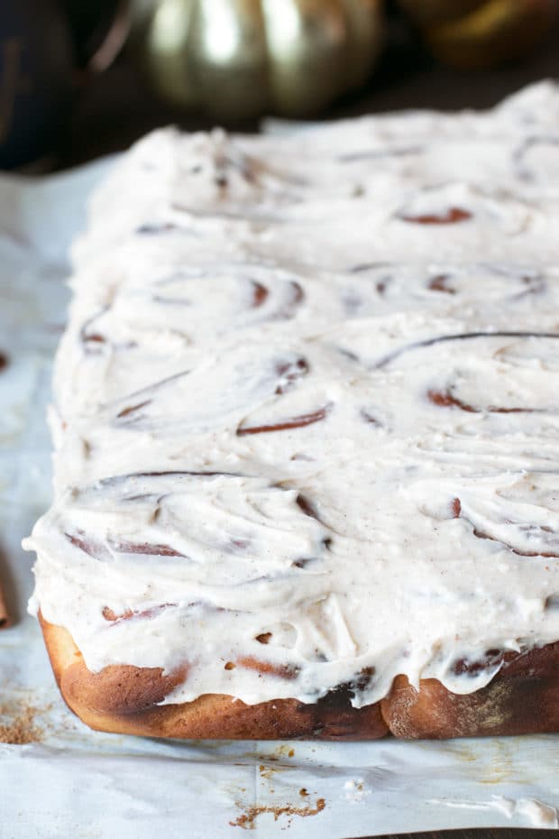 Pumpkin spice and chai spice combine in the dough, the filling and the cream cheese frosting to bring together intense, rich flavors that play off of each other in the most unique way. These rolls are bold and flavorful, without being cloyingly sweet, so you won’t feel like you are sucking on a sugar cube for breakfast. The warm dough, gooey spiced inside and cream cheese frosting all balance each other out, making you want to melt into an oversized armchair with a blanket, a book and a great cup of coffee for the rest of the morning.