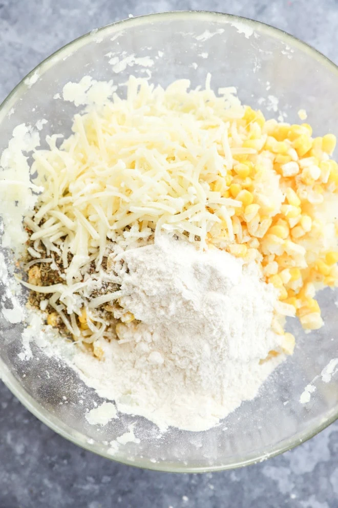 - Add corn kernels, cheese, pepper, salt, oregano, garlic powder, basil, red pepper flakes, and flours to the mashed potato. Stir to combine until mixed well.