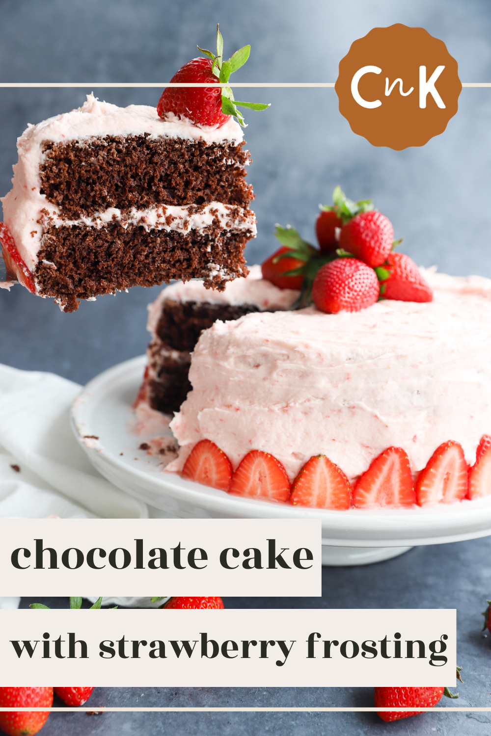 The best part about this cake, aside from the fluffy, moist chocolate cake layers, is the fresh strawberry puree in the buttercream frosting. The taste of strawberries literally pops in your mouth.