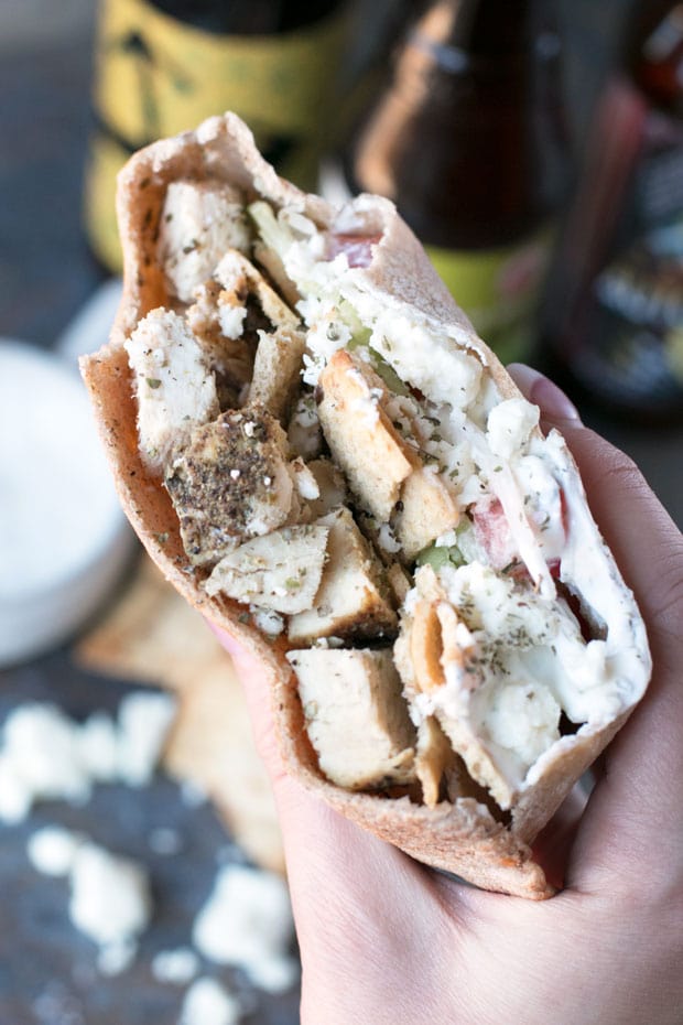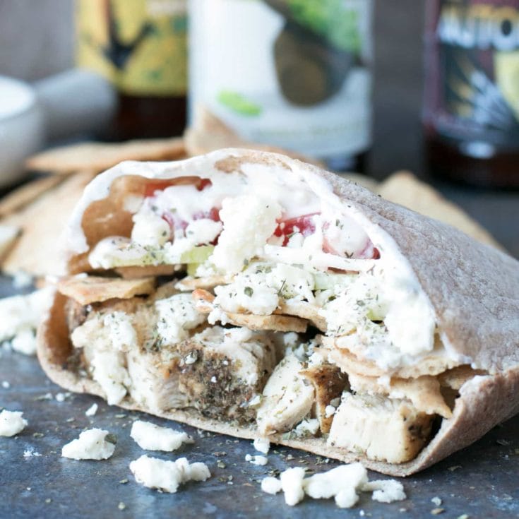 - Cut the top off of each pita to form a large pita pocket. Loaded up the pita with chicken, cucumber, tomato, sliced onion, pita chips, and feta. Top with the sauce and sprinkle a little extra marjoram on top. Serve.