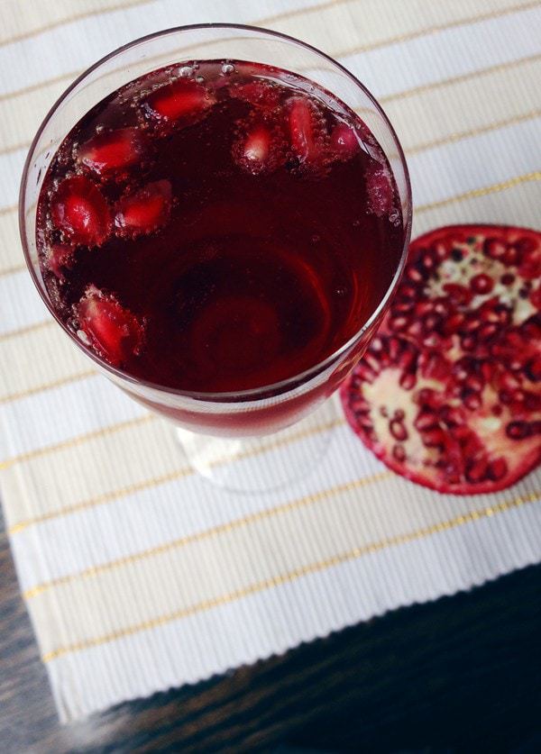 You’ll start with your champagne flutes and fill them with a bit of pomegranate juice. (You can find it at most supermarkets these days.) Gingerly top with champagne, then drop in a spoonful of ruby-like pomegranate seeds. They’ll float and dance with the bubbles, possibly in tune to whatever holiday music you’ve got playing. Your guests don’t have to know how easy it is to make champagne look even snazzier, and I’ll keep your secret.