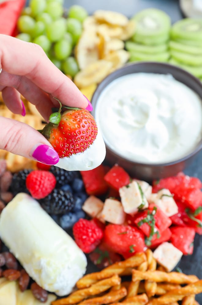 This fruity charcuterie board is so much fun to serve when you are hosting a party! It’s refreshing and celebratory, making it a centerpiece that everyone can gather around to graze and dip.