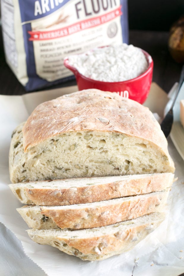 Harvest Pumpkin Seed Bread is the golden brown, crusty, crunchy artisanal bread you’ve been dying to eat and too afraid to make. However you won’t believe how easy peasy this bread is to make! In a few simple steps, and with the help of my favorite bread flour, your are going to be making this bread all season long!