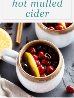 I like to garnish my hot mulled cider with fresh cranberries for a pop of color! You can also garnish with a slice of orange from the pot and a cinnamon stick.
