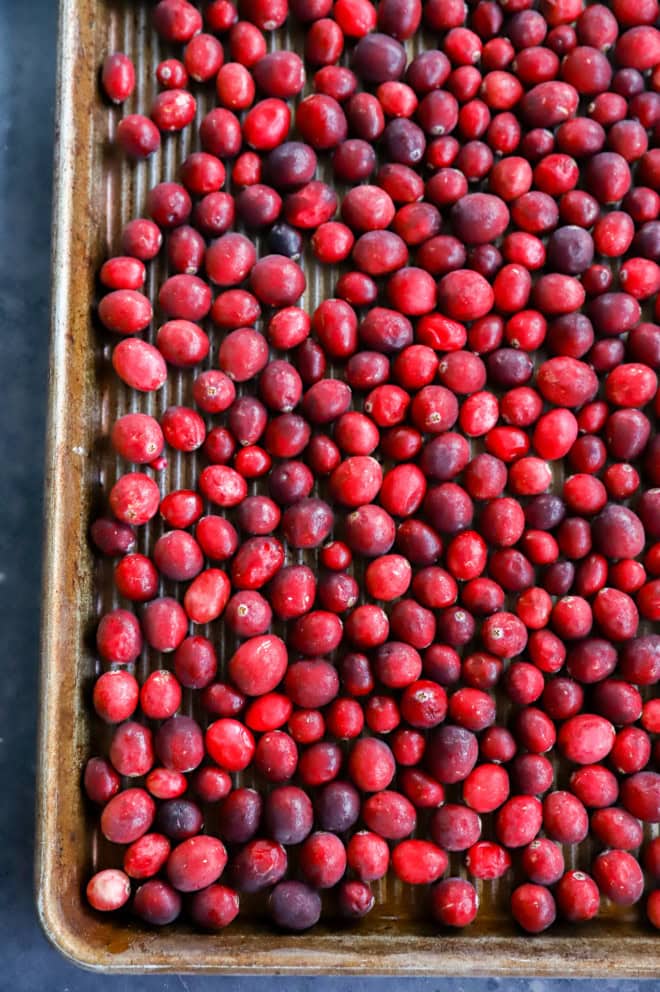 Use a rimmed baking sheet to freeze them. You don’t need to line it with parchment paper, but you can if you want to. Make sure that the berries are in a single layer so there is no overcrowding. The berries will freeze individually instead of turning into a clump of cranberries.