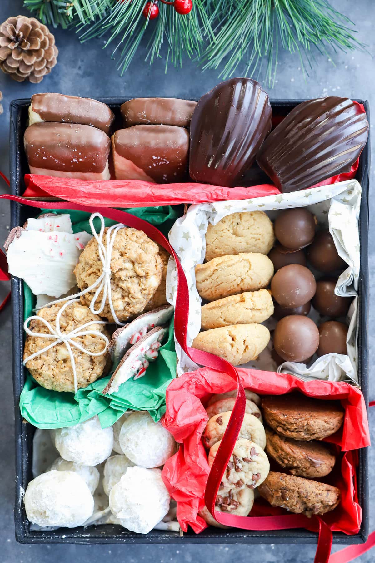 However, once I started getting into it, it was a lot easier than I realized! As long as you have a plan of what to do, you will easily be able to put your cookie boxes together. I recommend doing this with your kids, your friends, your partner, and/or your parents as a fun holiday tradition! Put on Christmas music or a holiday movie in the background, then bake, talk, giggle, decorate, and enjoy making some fun holiday memories. From chocolate chip cookies to fluffy madeleines to pecan tassies, bring your favorite recipes and enjoy packing up the goodies!