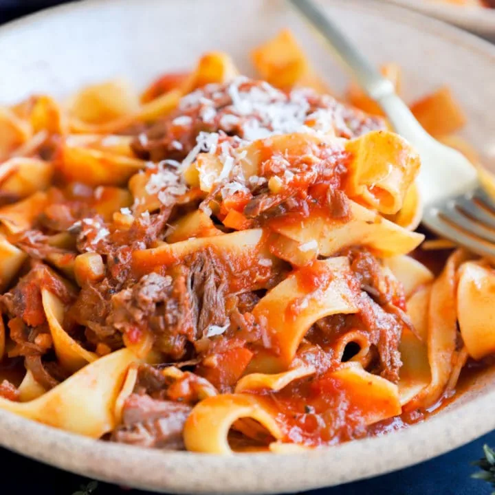 When serving this instant pot short rib ragu, make sure that you reach for your favorite pasta! I personally love to use pappardelle! You can also use spaghetti, linguine, gnocchi, etc. This dish also works well when spooned over mashed potatoes if you want to go that route.