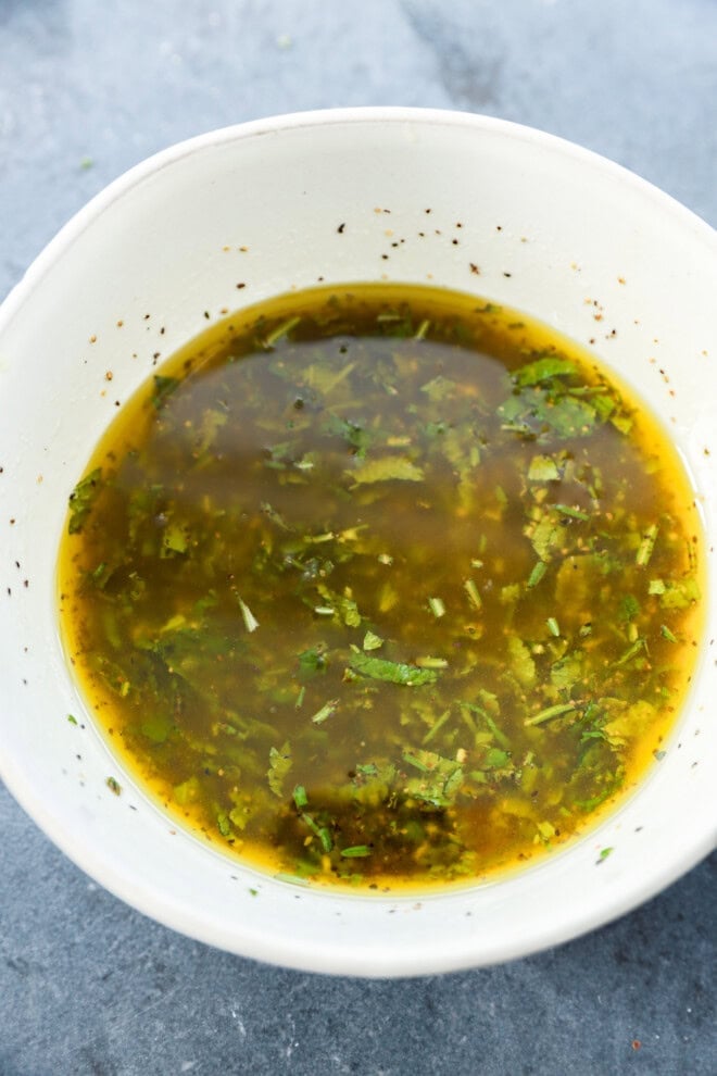 • In a medium bowl, whisk together extra virgin olive oil, apple cider vinegar, garlic, mint, rosemary, honey, salt and pepper.