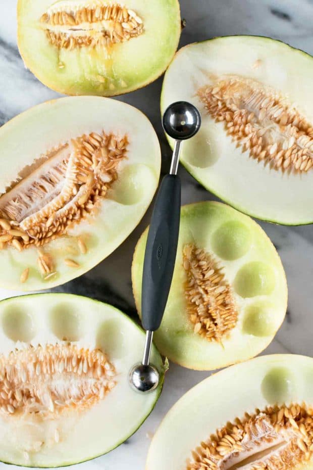 - Cut melons in half and remove seeds.
