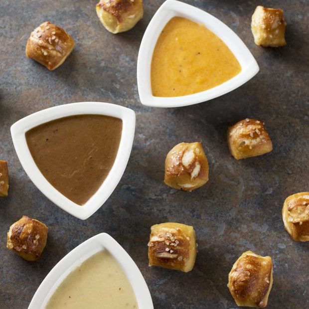 - Repeat this process with the remaining 2 dips. Serve immediately with warm, freshly baked pretzel bites.