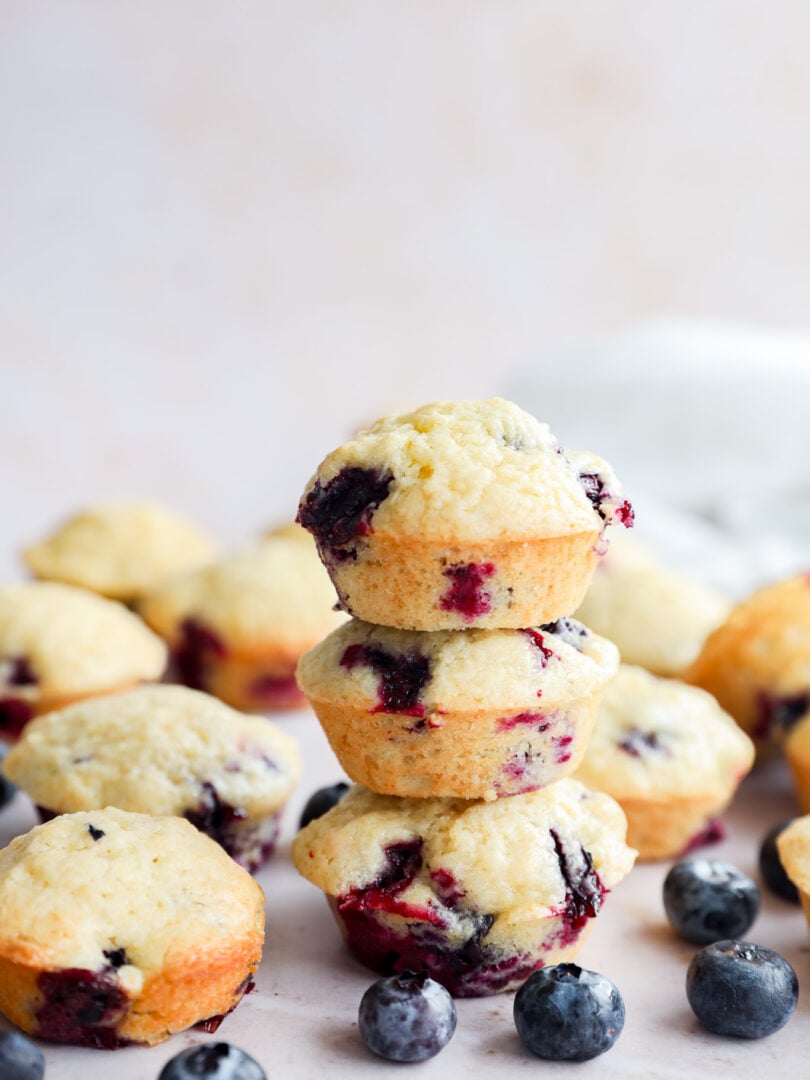 A stack of three mini blueberry muffins is surrounded by more muffins and fresh blueberries on a light surface, with a soft, blurred background.