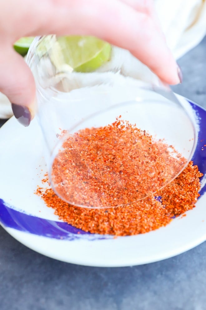 Tajin. I use this seasoning to rim the glass! You could also use coarse salt or coarse sugar for the rim.
