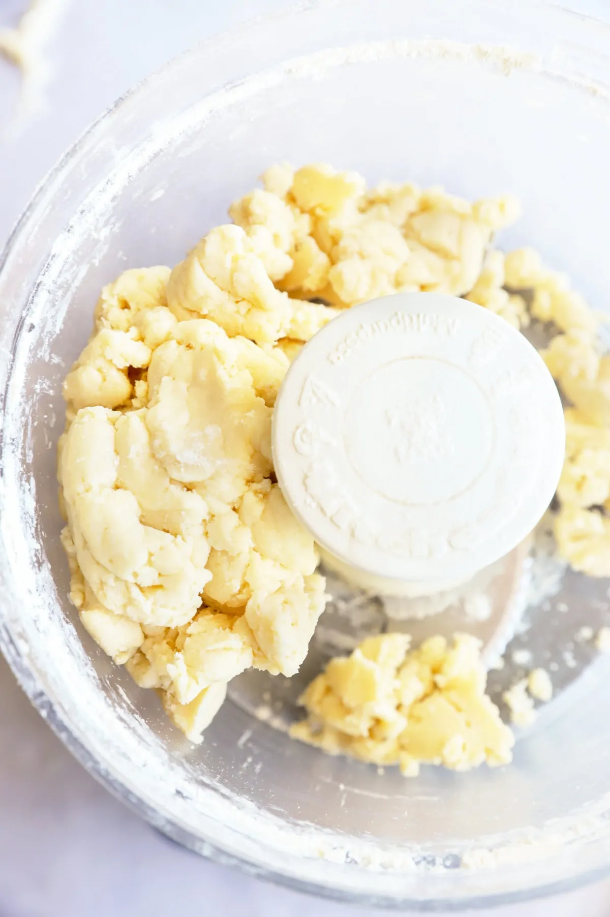 - Add flour, sugar, and salt to the bowl of a food processor.* Pulse a few times to mix. Add butter cubes and pulse about 8 to 10 times until the mixture resembles coarse crumbs. Turn the machine on and add in water, one tablespoon at a time. The dough should come together and form a ball. Dump out the dough onto a clean work surface and form into a 4-inch disk.