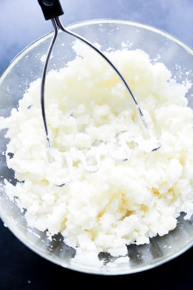 - Add the cooked potatoes to a large bowl. Mash well until creamy and there are no more lumps. Add butter, salt, garlic powder, pepper, heavy cream, egg, chives, and cheese. Stir until well combined.
