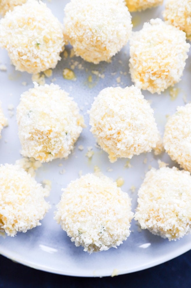 - Dip the balls in the flour, shaking off the excess. Dip in the beaten egg, shaking off the excess. Finally, roll in the panko, making sure the balls are coated well all over. Shake off any excess.