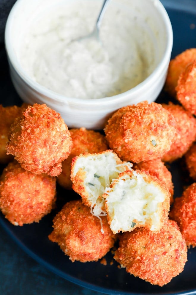 The crispy golden exterior gives you just the right crunch, and you are going to LOVE that cheese pull when you sink your teeth into one. The taste of the gooey inside is packed with potatoes and cheese, but also a bit of garlic and fresh chives. SO GOOD.