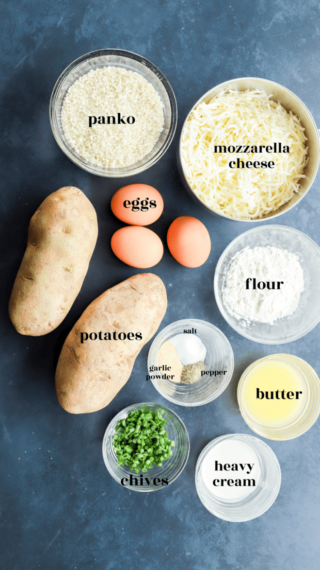 Think of these potato balls as a cross between a gooey mozzarella stick (kind of like cheese croquettes) and a fried mashed potato ball (or potato croquettes)! You get the creaminess of the potatoes with all the cheesy goodness of a mozzarella stick.