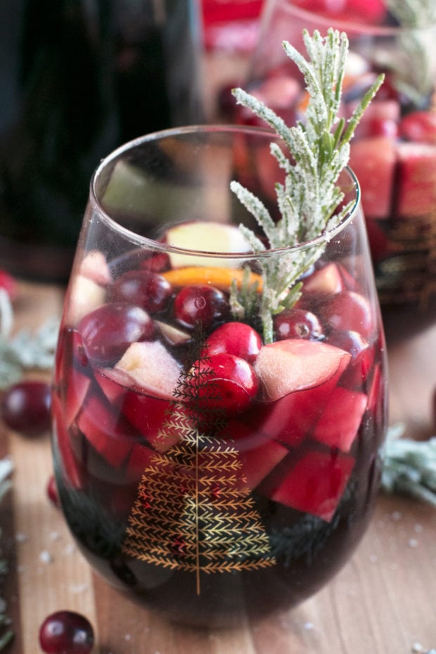 Red Christmas Single Serve Sangria is how I get my sangria fix, without making an entire pitcher of the stuff! Instead of dealing with hosting a party to get rid of a giant batch of sangria, you can celebrate your general fabulousness this holiday season with a festive glass of sangria just for Y-O-U. Garnished with a sugar-coated sprig of rosemary, you’ll be feeling all merry and bright with every sip.