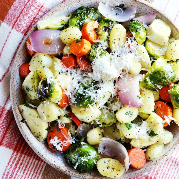 Sheet Pan Gnocchi with Winter Vegetables is how you turn a package of gnocchi from the store into one of your favorite easy wintertime meals. You don’t even have to boil the pasta on the stove! Serves 4 and ready in 30 minutes.