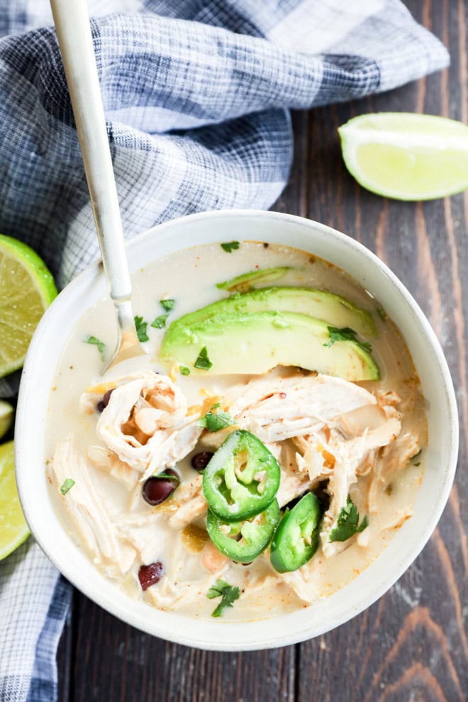 You can serve this creamy crockpot white chicken chili with all of your favorite toppings. We like to add sliced jalapeno, sliced avocado, fresh cilantro, and a lime wedge on the side for a little extra tang (that squeeze of lime juice at the end is so good!) Other topping ideas include shredded cheese (Mexican blend or monterey jack cheese), crushed tortilla chips, and hot sauce (or pinch of red pepper flakes).