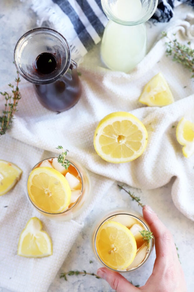 To make the drink, simply pour in a few ounces of lemonade concentrate with sparkling water over ice in your favorite glass like a highball glass and stir together. Float a couple of ounces of the iced tea concentrate on top and garnish! I think a garnish of a lemon slice and sprig of thyme or fresh mint looks simple and gorgeous 🙂