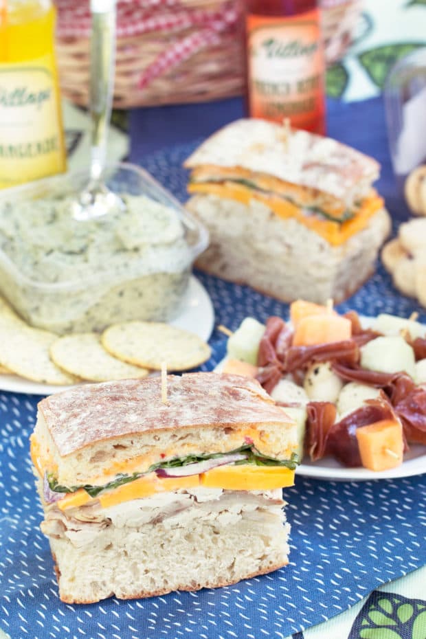 The real star of the basket is the Spicy Rotisserie Chicken Pressed Sandwich. I can’t even begin to tell you how easy these sandwiches are to throw together. You simply pick up a delicious rotisserie chicken from Tony’s Market (any flavor!) and layer it up with cheddar cheese, red onion, spinach and Samurai sauce.