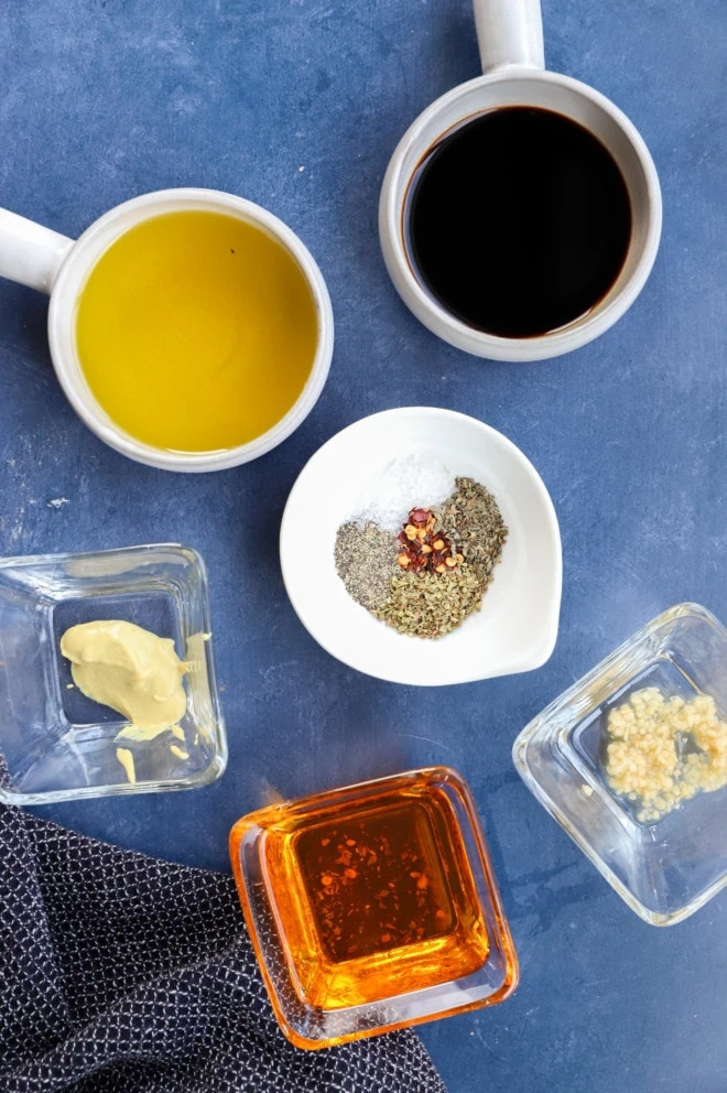 In a small bowl, whisk together oil from the sun-dried tomatoes (or extra-virgin olive oil), balsamic vinegar, garlic, dijon mustard, oregano, basil, red pepper flakes, pepper, and salt.