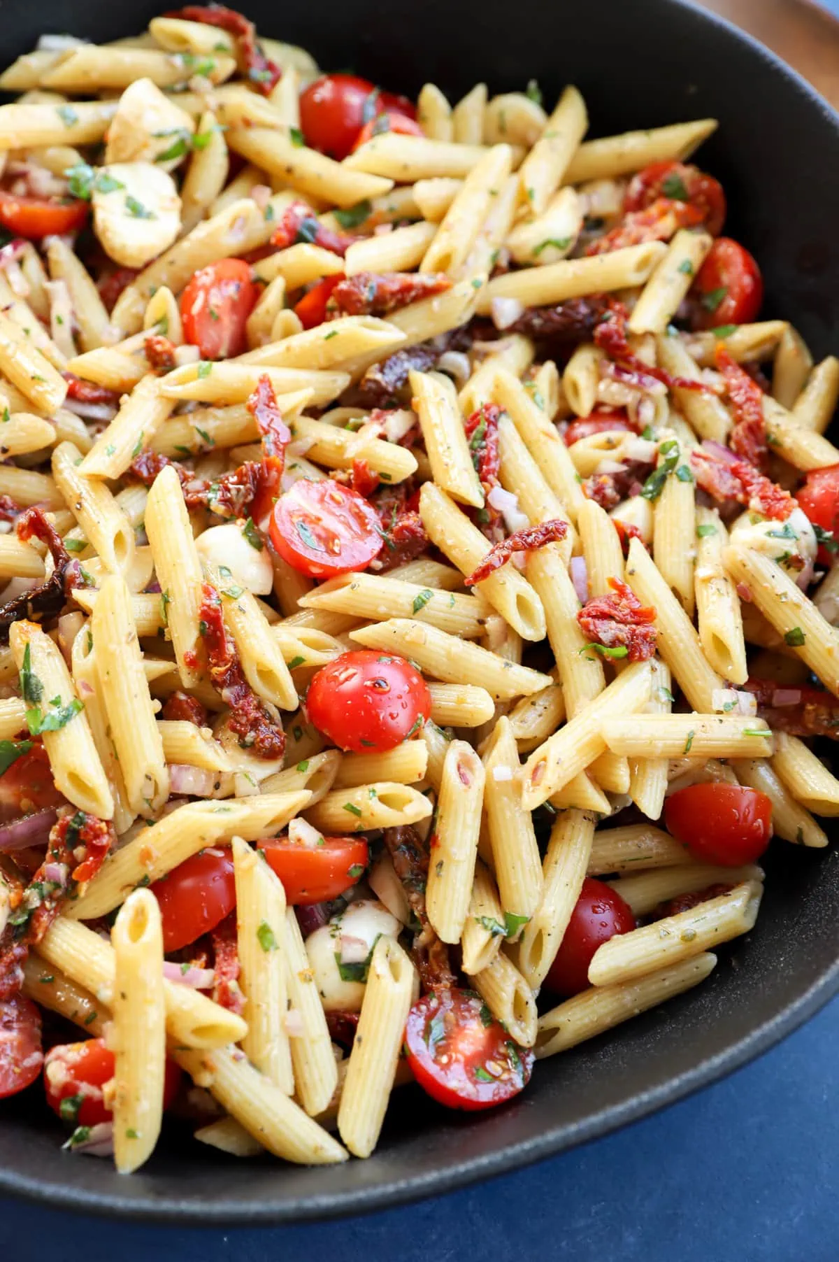 The dressing for this pasta salad has so much depth of flavor, primarily because instead of using extra virgin olive oil, I use the oil from the jar of sun dried tomatoes. You get all the of flavor of those tomatoes, garlic, and herbs from the oil.