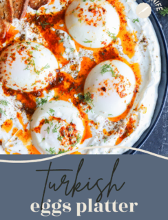 This Turkish Eggs Platter, also known as Çılbır, is a simple hearty meal that features beautifully poached eggs with a base of garlic yogurt and a drizzle of chile butter. With a fresh sprinkle of dill, serve with plenty of toasted bread.