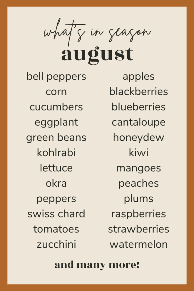 Incorporating these seasonal gems into your cooking allows you to create dishes that are not only bursting with flavor but also packed with nutrients. Since the produce is at its freshest, it requires minimal effort to shine in simple, delicious recipes (if you need some inspiration, be sure to scroll down to the august recipes list below!).